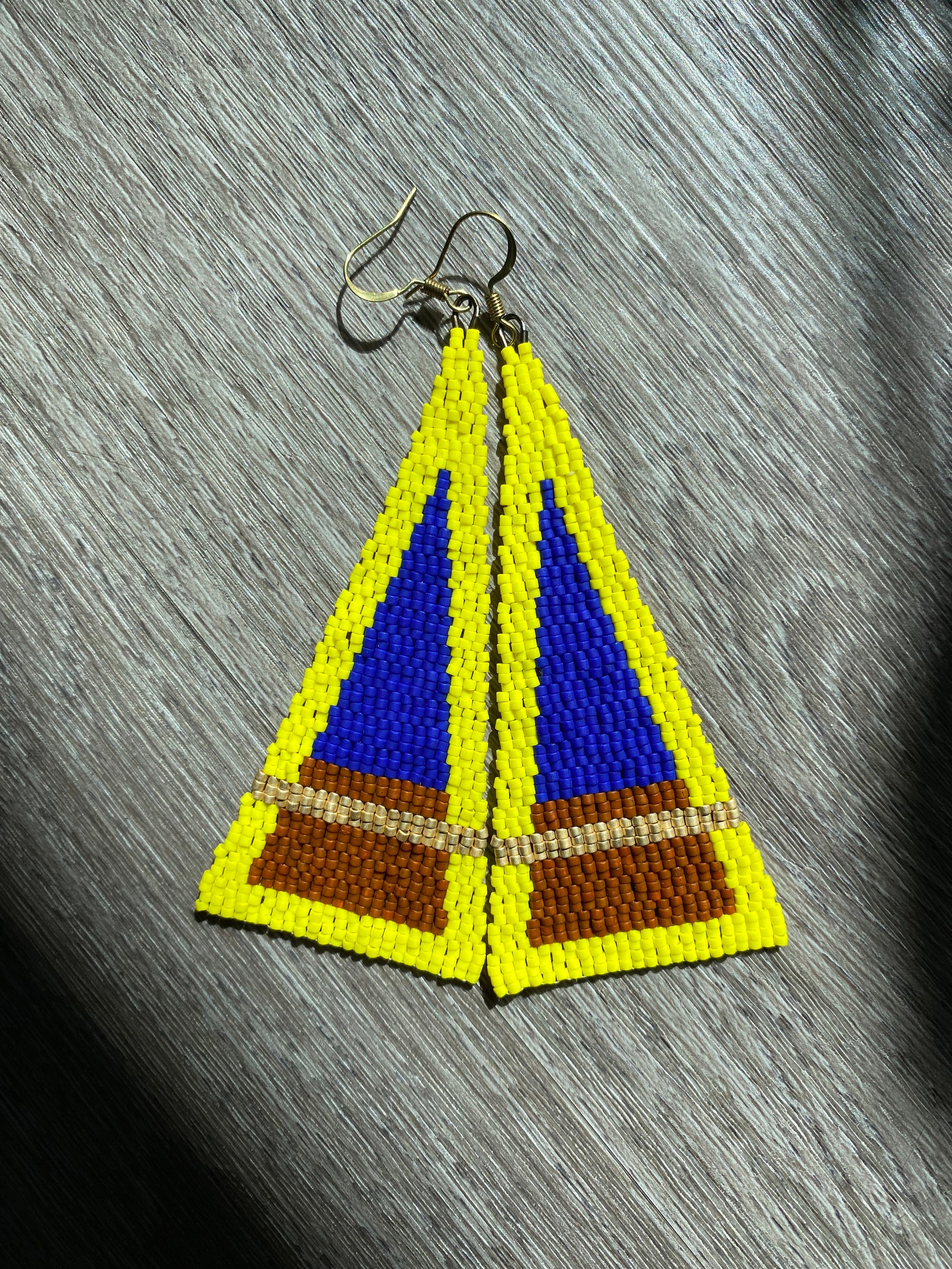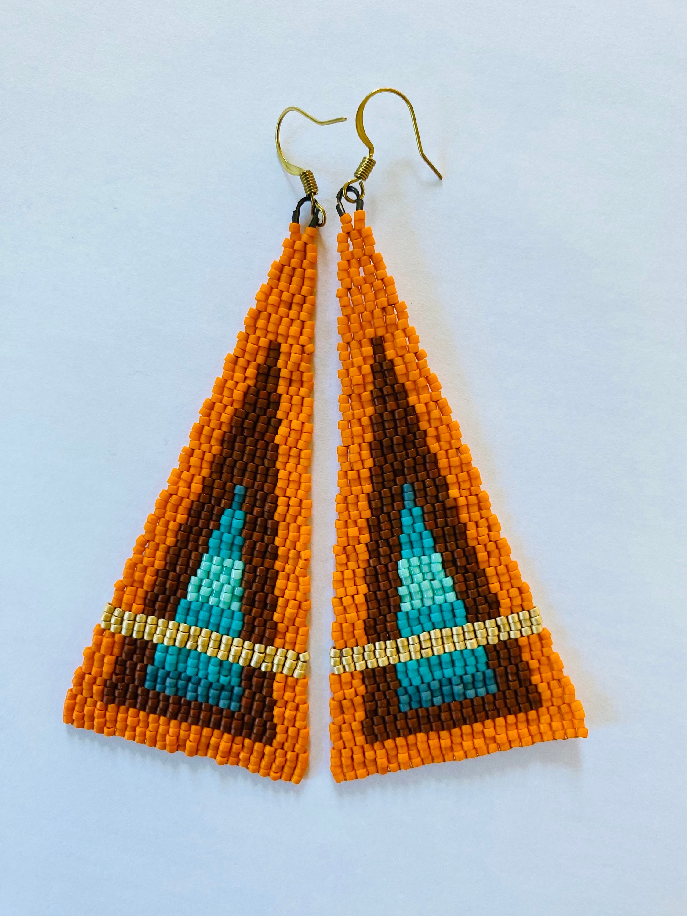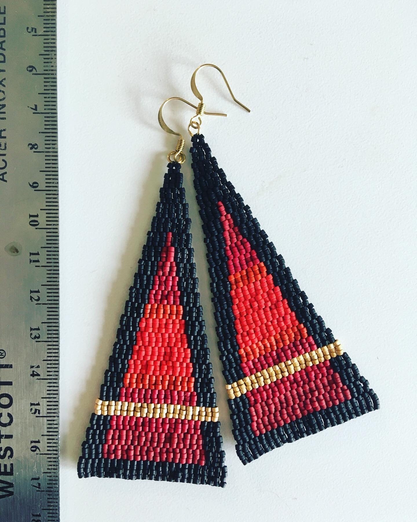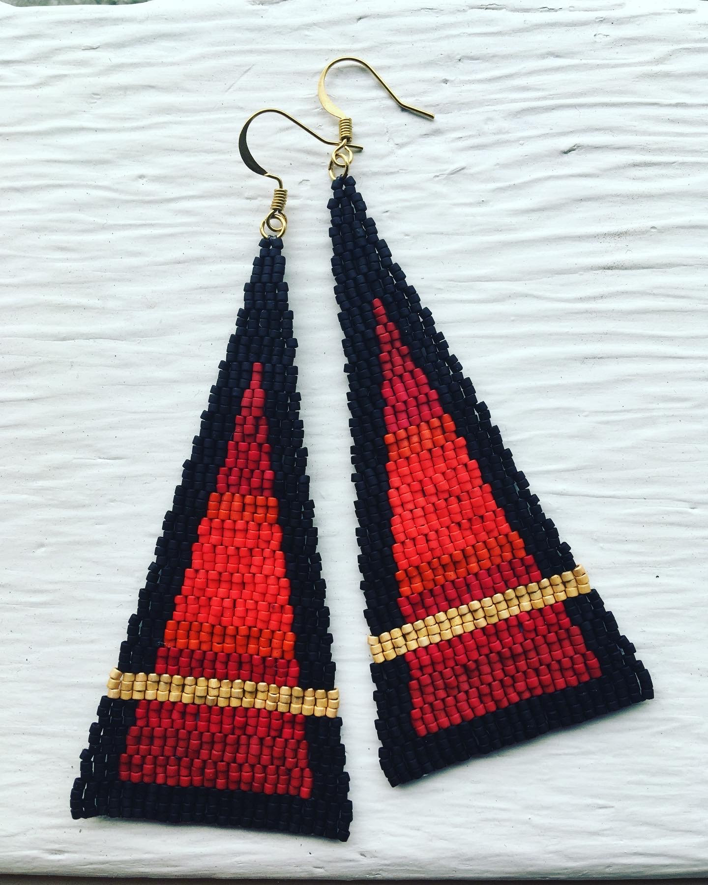 Delica beadwork, blended reds against a black background with a bold gold stripe.